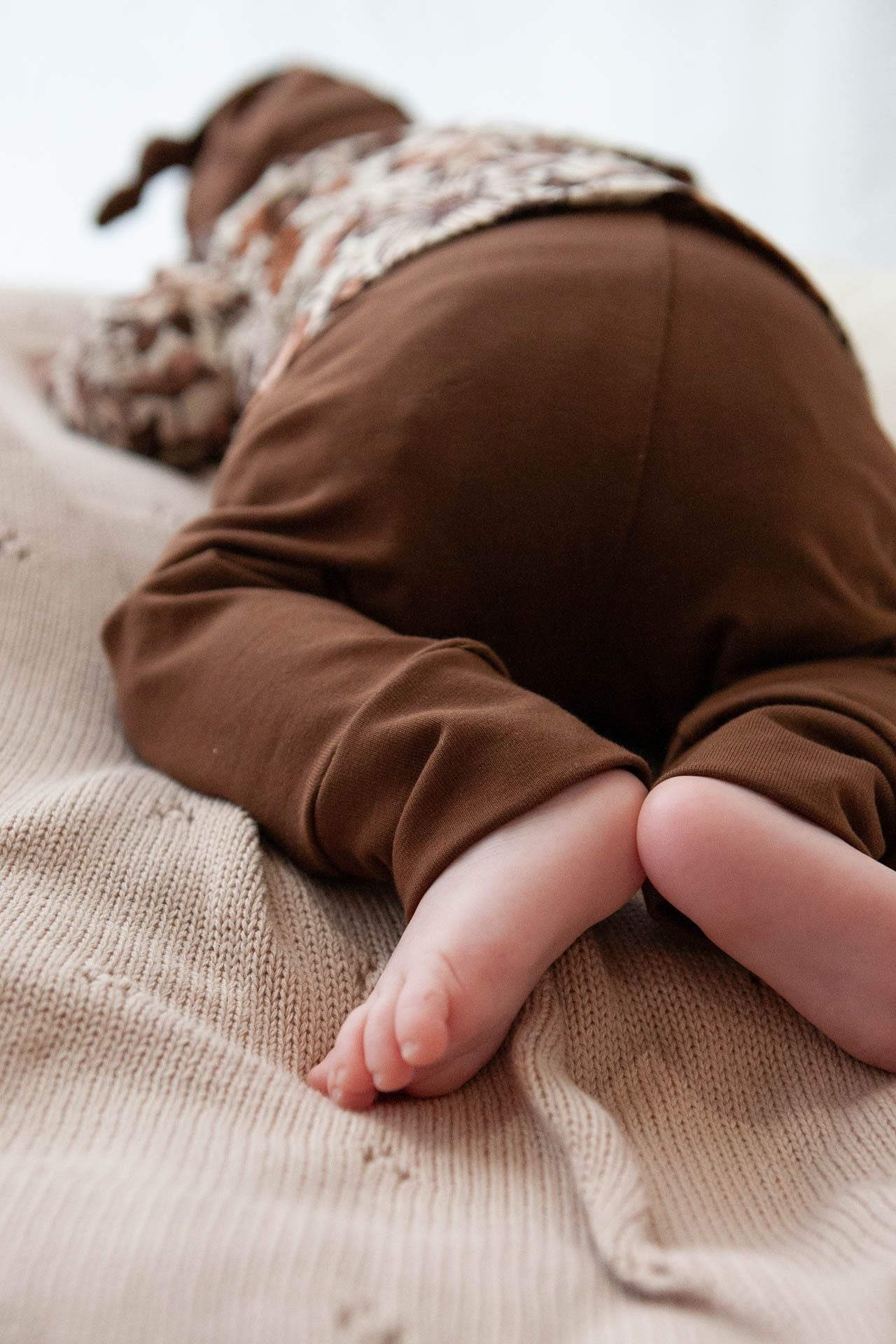 Dit zachte babybroekje is gemaakt van een rekbare, eco-gecertificeerde jersey stof die heerlijk aanvoelt op de huid. Het bovenboord bestaat uit een dubbele laag stof โ€“ zonder harde elastiekrand, maar met een zachte en comfortabele aansluiting boven de luier. Precies zoals je dat wilt voor een pasgeboren baby.