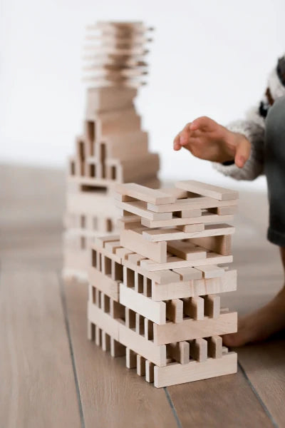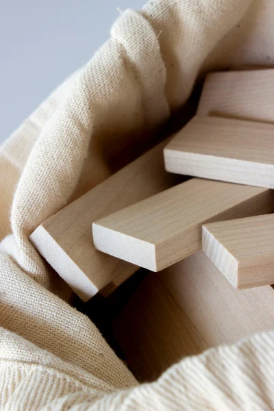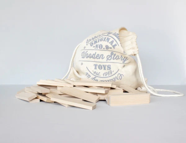 De Houten blokken in zak van Wooden Story vormen een prachtige mix van eenvoud, elegantie en vrijheid: een set van natuurlijke houten bouwstenen in verschillende vormen, zorgvuldig afgewerkt voor eindeloos architectonisch plezier. Het hout komt uit FSC®-gecertificeerde leveranciers, is glad geschuurd en behandeld met plantaardige oliën — een natuurlijke feel die uitnodigt tot aanraken, stapelen en ontdekken. {cite lines about wood from source}